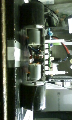 前輪のシャーシを見てほしい。肉抜きをしすぎたのかシャーシ自体の剛性が足りなく、指で軽く押すと簡単にたわんだりしていた。ギヤボックス上部につっかえのための棒または板を取り付ける必要があるな。